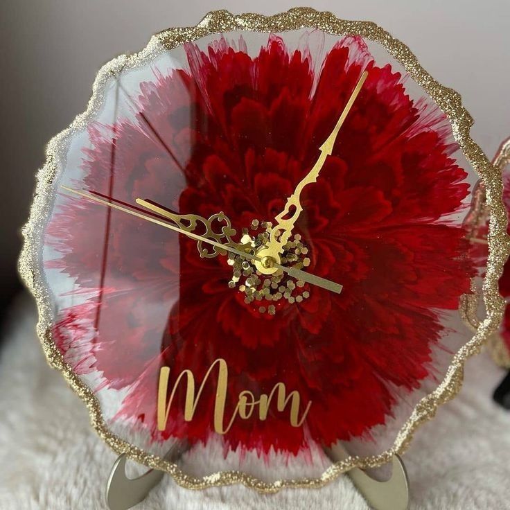 This handcrafted resin clock celebrates motherhood with elegance and emotion—featuring a vibrant red floral design, gold detailing, and the word “Mom” engraved in graceful script. A perfect keepsake for birthdays, Mother’s Day, or adding a heartfelt touch to home décor.
