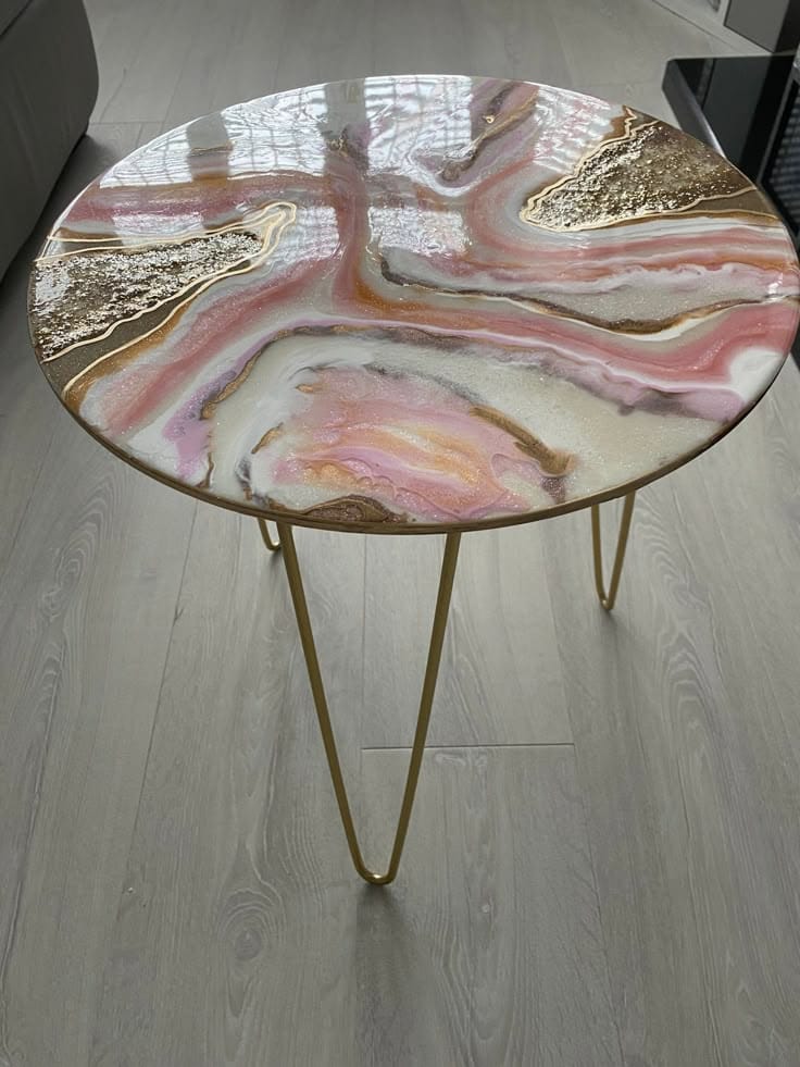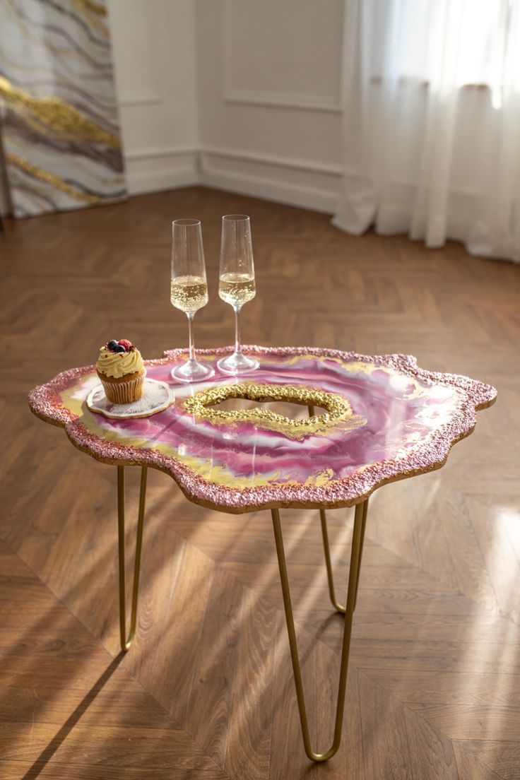 This handmade corner table has a shiny geode-style resin top with natural colors and sparkle. It adds beauty and function to small spaces at home.
